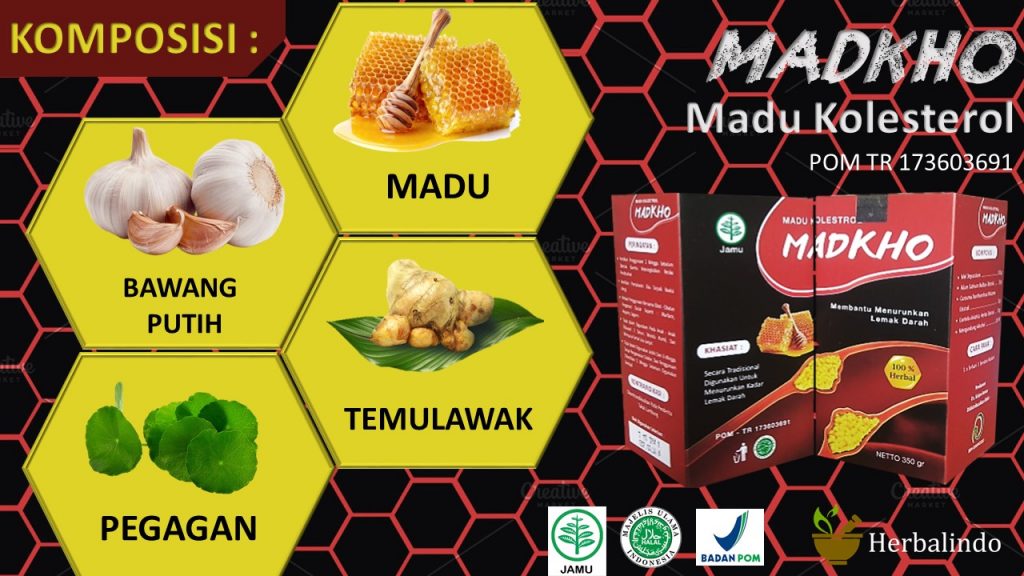 Madu Kolesterol Madkho merupakan produk herbal yang terbuat dari madu, ekstrak bawang putih, ekstrak temulak, ekstrak pegagan dan bahan lainnya. Diformulasikan secara khusus untuk menurunkan kadar lemak darah atau untuk penyembuhan penyakit kolesterol dan asam urat dengan cara menurunkan kadar lemak dalam darah.
